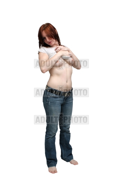 Description: A lovely young redhead wearing jeans and a tank top with exposed breasts. Isolated on a white background with generous copyspace.