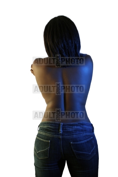 Description: A lovely young black woman stands topless, facing away from the camera. Isolated on a white background with generous copyspace.