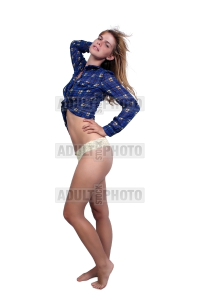 Description: A beautiful, sexy young blonde wearing a plaid shirt and thong panties. Isolated on a white background with generous copyspace.