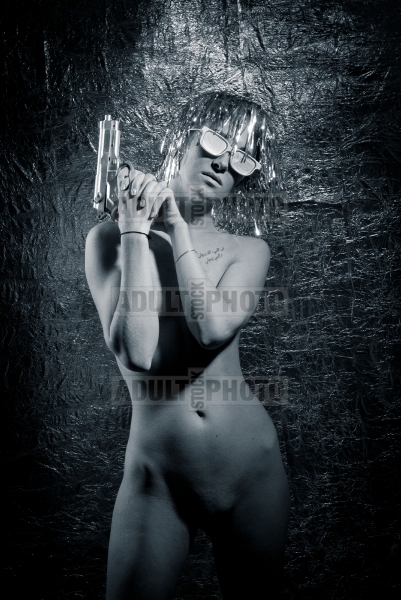 sexy nude girl in a wig and with a gun