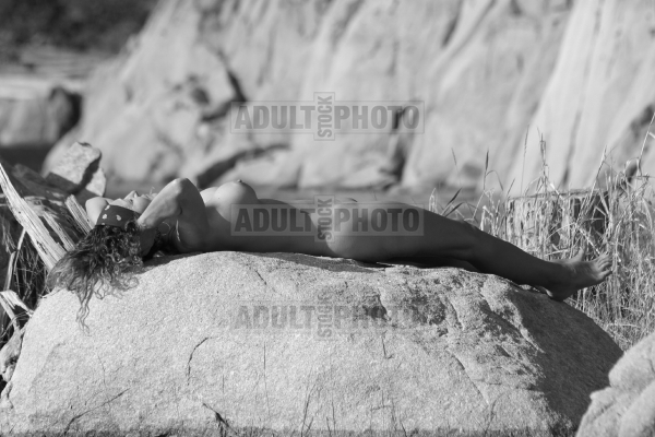 Description: Nude female model posing on a rock
