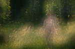 Description: semi-nude brunette woman posing in strappy black minidress on bed.