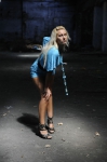 Description: A beautiful, young, sexy blonde wearing a denim skirt and open denim jacket. Isolated on a black background with generous copyspace.